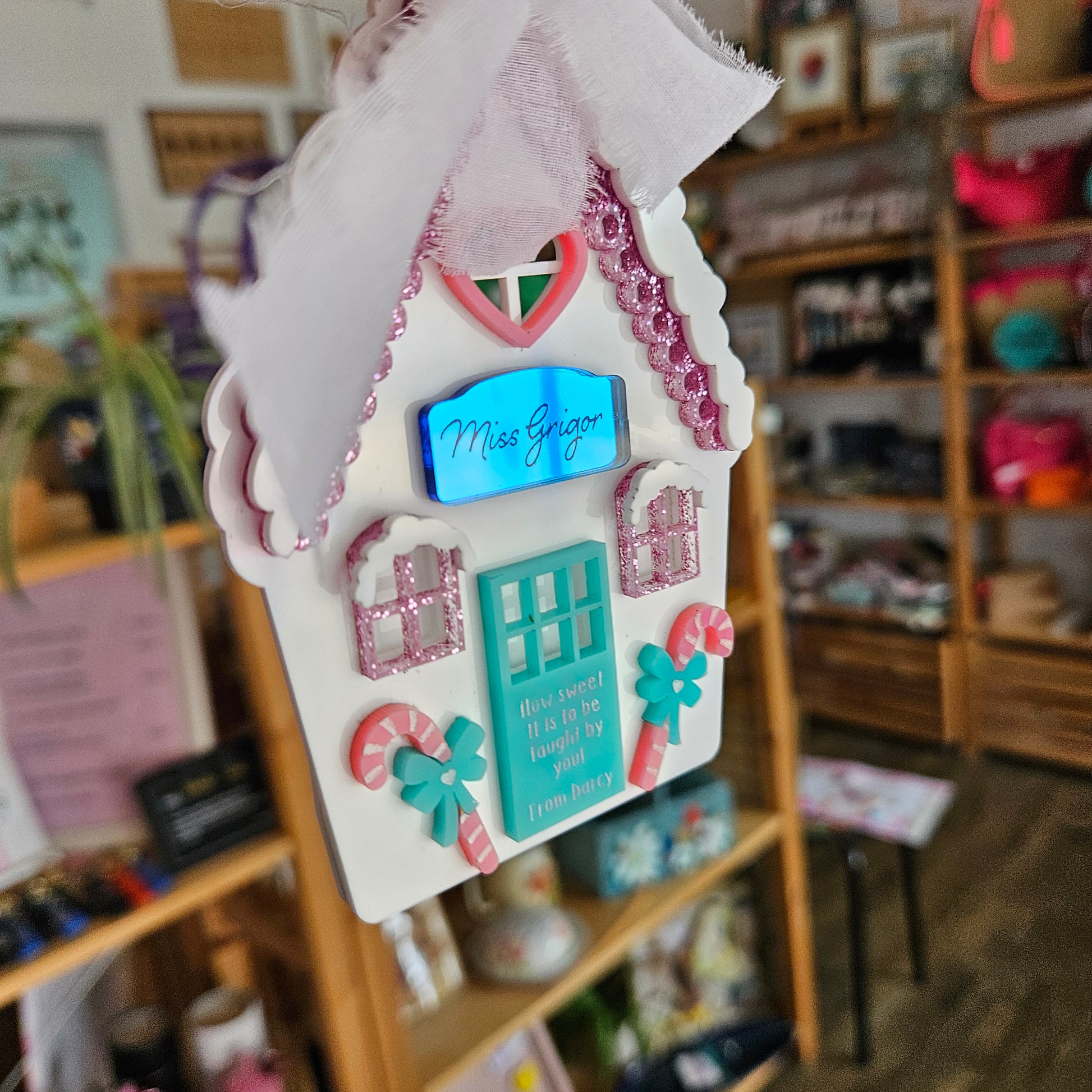 personalised teacher Christmas gift Australia. gingerbread house teacher ornament. teacher ornament with gift card holder. handmade teacher gift Australia. pastel Christmas decoration. Red Hill Creative Kitschmas